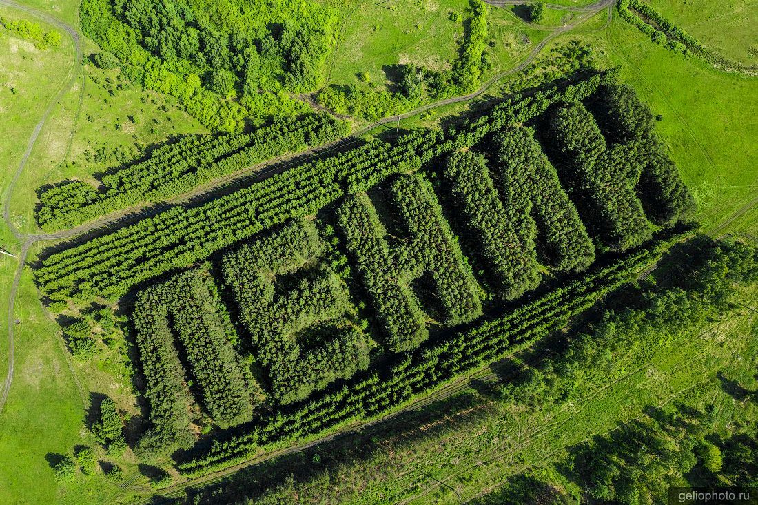 В Омской области, неподалёку от Тюкалинска, на карте можно разглядеть редкий пример «живого» памятника советской эпохи — лесной геоглиф «Ленин», выложенный из елей и сосен. Он был посажен в 1970 году к столетию со дня рождения Владимира Ильича и занимает около двух гектаров. Летом, когда зелёные кроны полностью раскрываются, надпись особенно выразительно выделяется на фоне окружающего лесного массива. Каждая буква достигает 60 метров в высоту и состоит из многорядных посадок деревьев, что делает объект видимым только с воздуха.