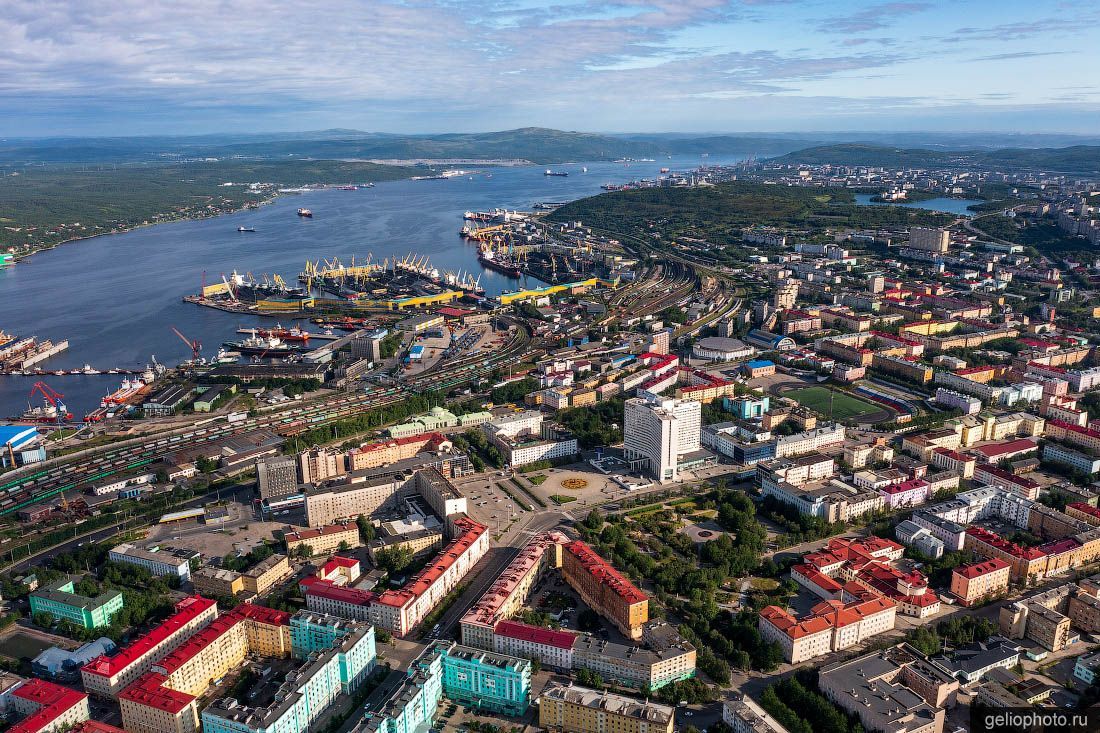 Мурманск — крупнейший город за Полярным кругом и один из немногих незамерзающих портов России. Его расположение на берегу Кольского залива придаёт пейзажам особую привлекательность: с высоты открываются панорамы судоверфей, жилых кварталов, сопок и бескрайней воды, уходящей за горизонт. Особенно впечатляют снимки в период полярной ночи и белых ночей, когда небо окрашивается в необычные цвета, а город будто погружается в атмосферу фантастического фильма. Индустриальные объекты, портовая инфраструктура и жилые районы здесь тесно переплетаются, создавая сложную и при этом гармоничную картину северного мегаполиса.