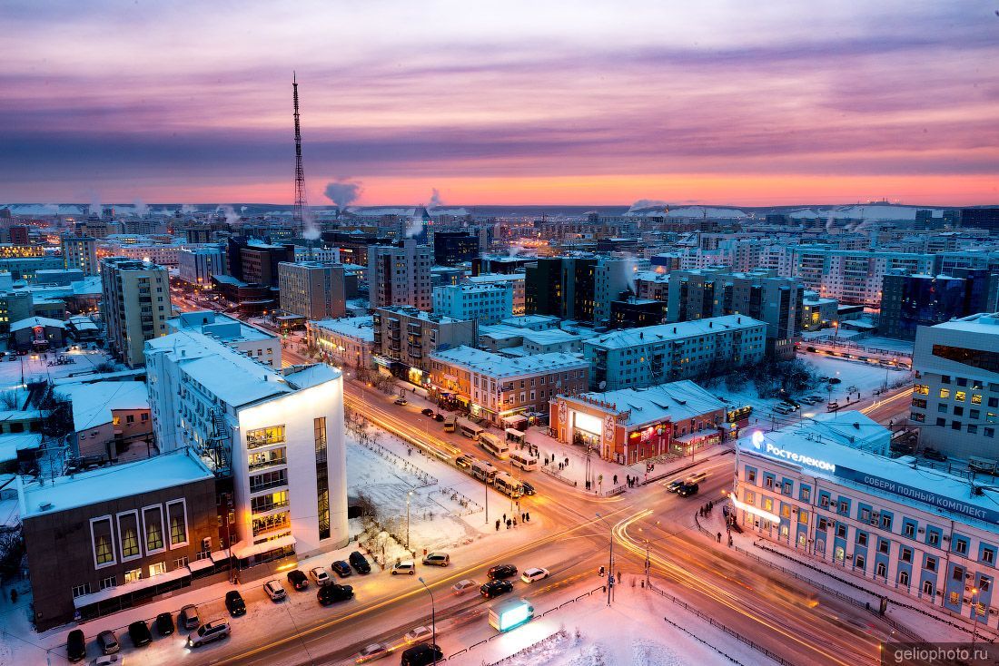 Когда солнце опускается за горизонт, Якутск преображается: улицы наполняются мягким светом фонарей, а в окнах домов и офисов загораются сотни огней. На центральных проспектах отражения неоновых вывесок смешиваются с вечерними сумерками, создавая особое ощущение уюта и жизни даже в морозные зимние месяцы. Лёд на реке Лена под тонким снежным покровом мерцает в свете редких фонарей на набережной, а над городом поднимается прозрачный пар — характерная примета сурового климата. Вечерний Якутск — это контраст ярких огней и северной тишины, где городская динамика переплетается с неспешным ритмом жизни на краю вечной мерзлоты.