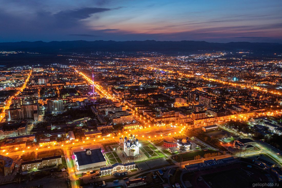 Купить фото Южно-Сахалинска вечером через Gelio Photo — это возможность быстро и удобно приобрести готовые изображения высокого качества.