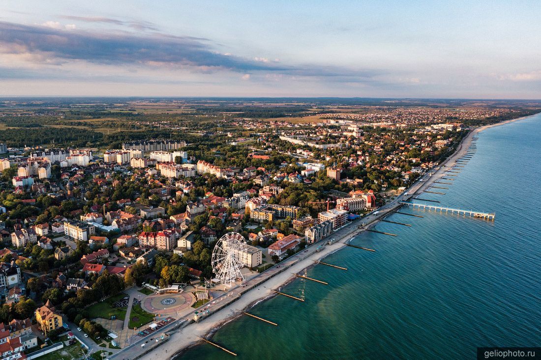 Зеленоградск — уютный город на побережье Балтийского моря, привлекающий туристов своими живописными пляжами, европейской архитектурой и атмосферой спокойствия. С высоты открывается панорама его узких улочек, ухоженных парков и широких прибрежных зон, создающих гармоничный городской пейзаж. Здесь можно увидеть величественное здание водонапорной башни, которая является символом города, или протянувшуюся вдоль моря набережную с уютными кафе и смотровыми площадками. Благодаря уникальному расположению города на Куршской косе и обилию зелёных зон, с воздуха он выглядит особенно привлекательно, что делает его идеальной темой для фотосъёмки.